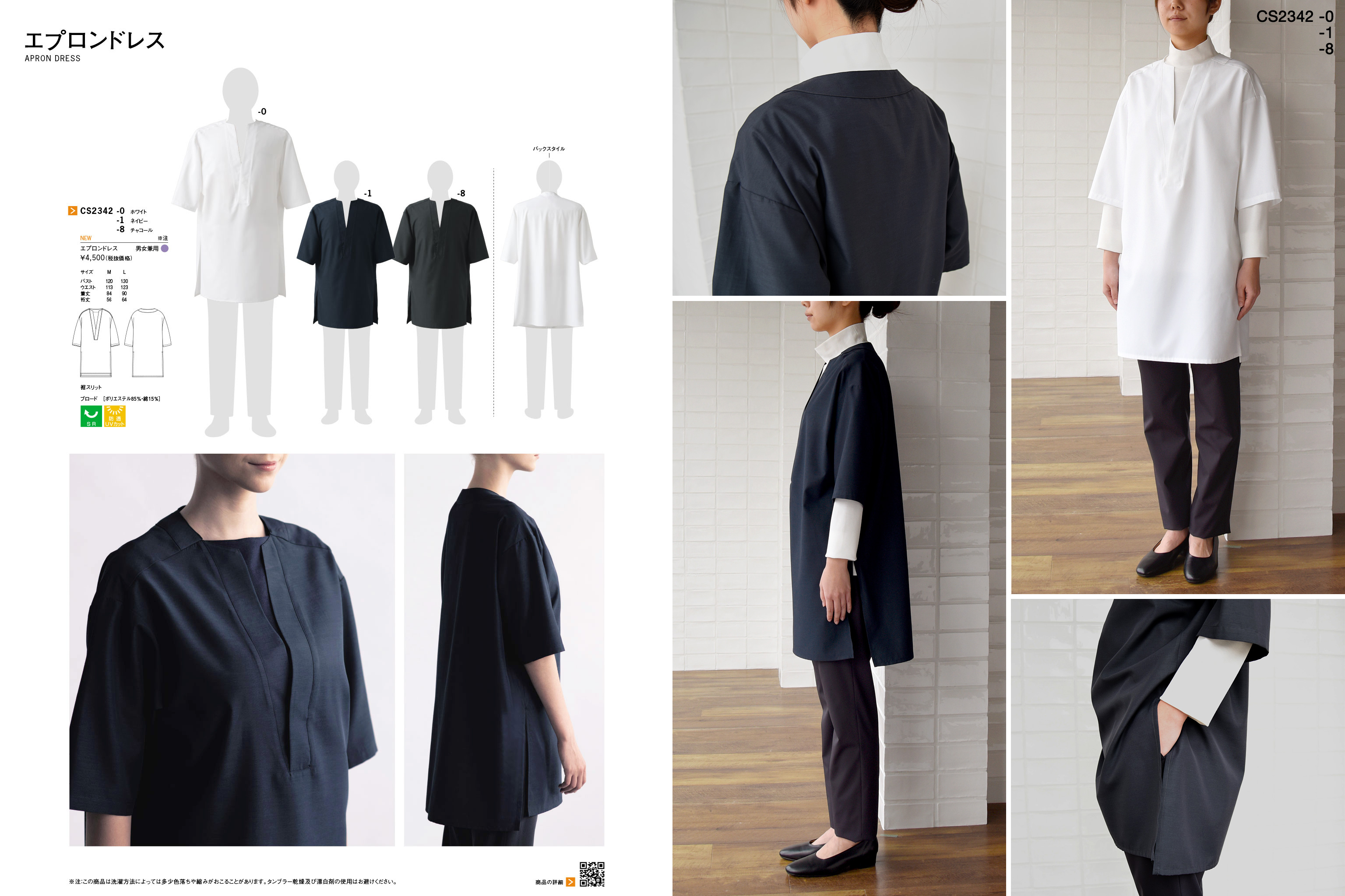 同素材、同色展開の「シャツ地の7分袖シャツコート(BA1077、BA1075、BA1076)」とこちらのエプロンドレス(CS2342)とをセクション別に着用すると、異なるアイテムでありながらも統一感あるコーディネートも可能です。