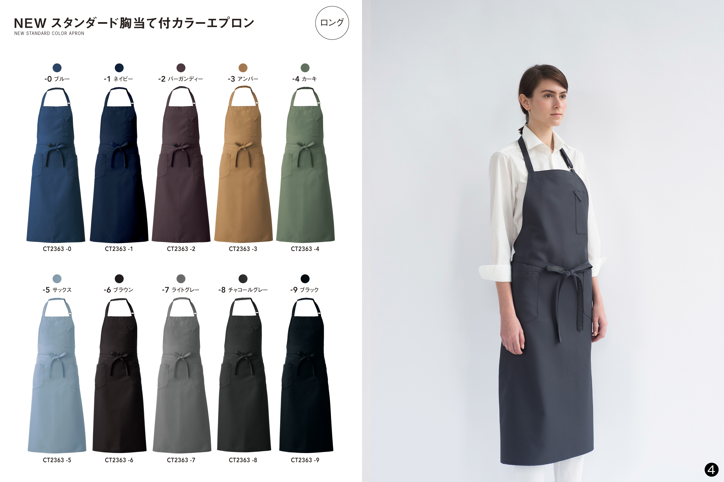 新製品の新定番エプロンシリーズ「NEWスタンダード胸当て付カラーエプロン(CT2361CT2362CT2363/丈サイズ違い3種・各全10色)」は、ポリエステル100%の丈夫な素材でありながら、滑らかで落ち感と光沢感のあるシルクの様な質感です。 接ぎ目を無くして生地感を最大限に表現し首掛けタイプにすることで、ミニマルでクリーンな印象に。さりげないデザインポイントとして、胸には三角フラップ付きペン差しポケットを添えました。 丈は着用する人の身長によってぴったりな長さを選べるよう、ショート(CT2361)、ミドル(CT2362)、ロング(CT2363)の3種類をご用意し、それぞれの丈感にもこだわりました。ショート丈は男性が着ても可笑しくない、自然で適度な丈感に。ロング丈は一般的なサイズより長めに設定し、ソムリエエプロンの様な少し落ち着いた印象のシルエットを目指しました。