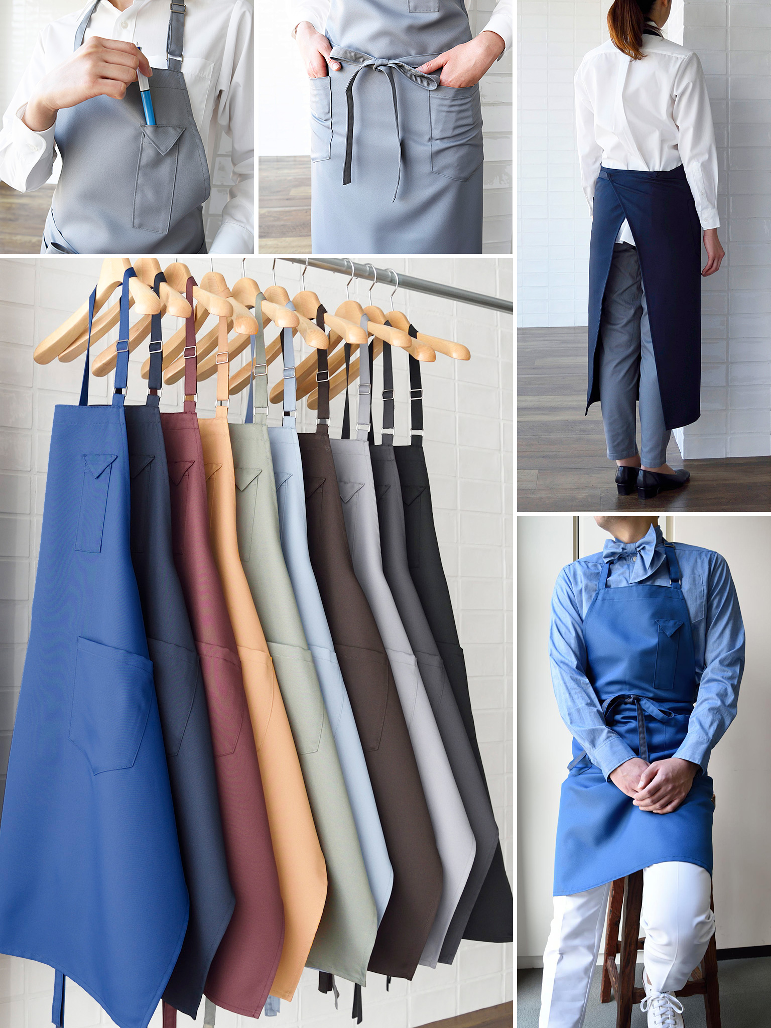 ユニフォームにおいて、サイズ選びは重要です。エプロンも着用する人の身長とエプロンの丈のバランスによって、その印象は全く変わります。この胸当て付エプロンは、素材感を活かしたシンプルなデザインのため、少し長めのシルエットになる様に着用していただきたいエプロンです。そのためミドルとロングの丈違いをご用意していますので、ぜひ身長に合った丈サイズを選んでください。 カラーパレットは、白や黒のフォーマルなシャツはもちろん、私服をベースにした仕事着とも相性の良い、少しスモーキーで落ち着いた色で揃えました。ネイビー(-1)、バーガンディー(-2)、ブラウン(-6)チャコールグレー(-8)は、特に色の濃度にこだわって、大人っぽさとカルチャーの深さを感じる様なシーンにオススメします。