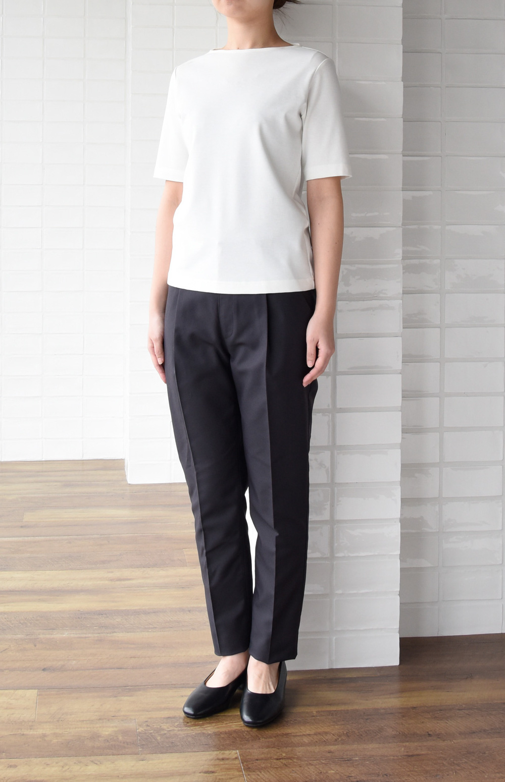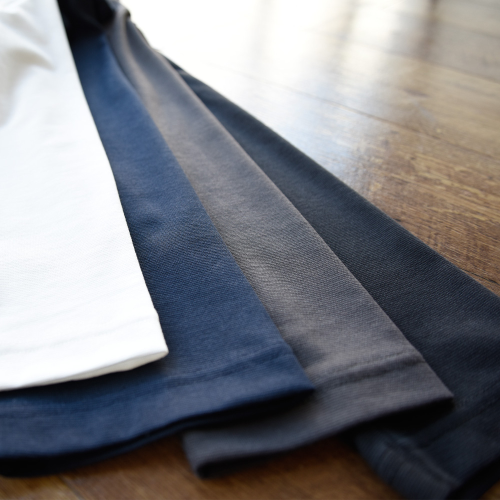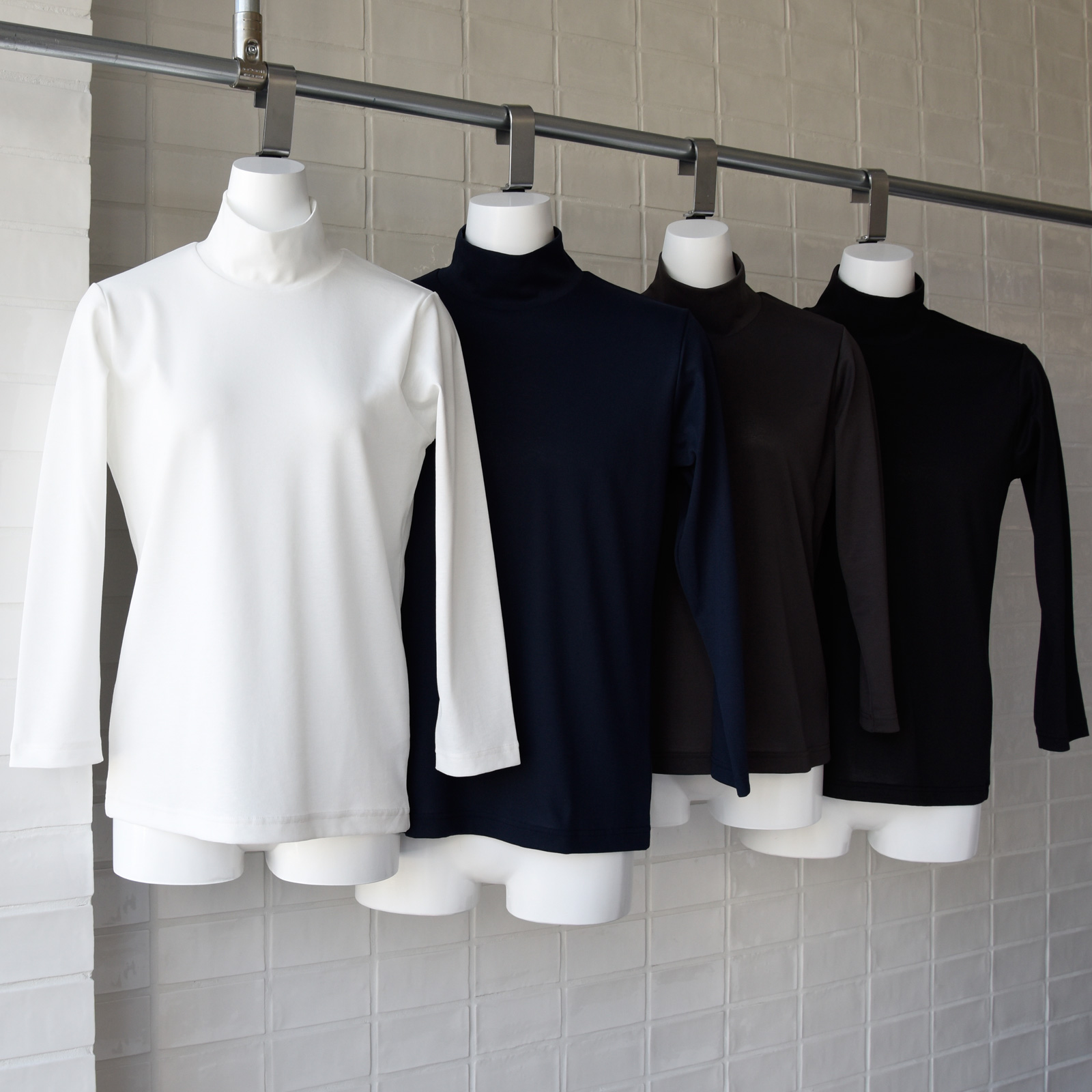 カラーはホワイト(-0)、ネイビー(-1)、チャコール(-8)、ブラック(-9)の4種類をご用意しました。ニットシャツはカジュアルな印象になりやすい傾向がありますが、スーツのインナーにもできるようなシックな色味にすることで、1枚でも、ジャケットと合わせても綺麗にキマります。同じく2019年新商品のツイル生地のジャケット&パンツとも相性が良いです。