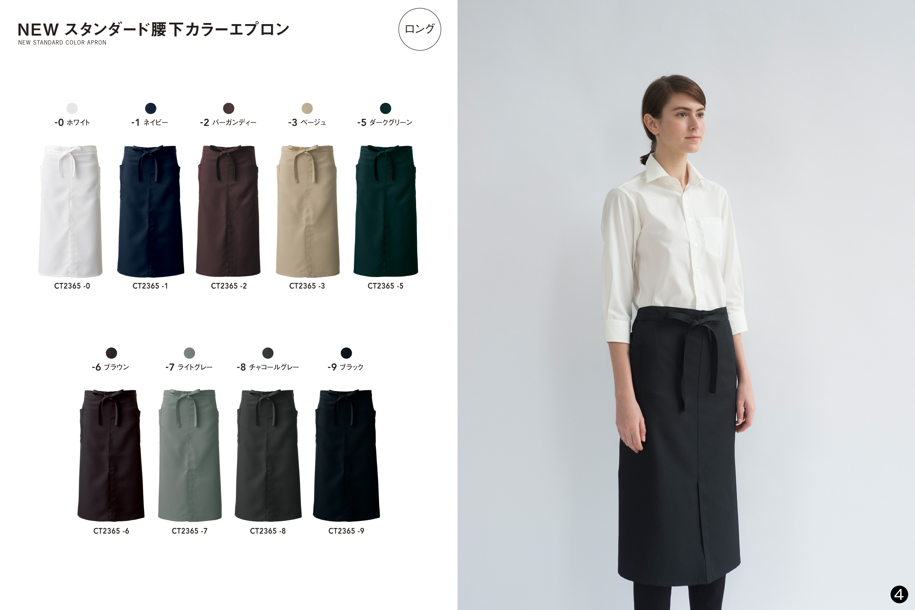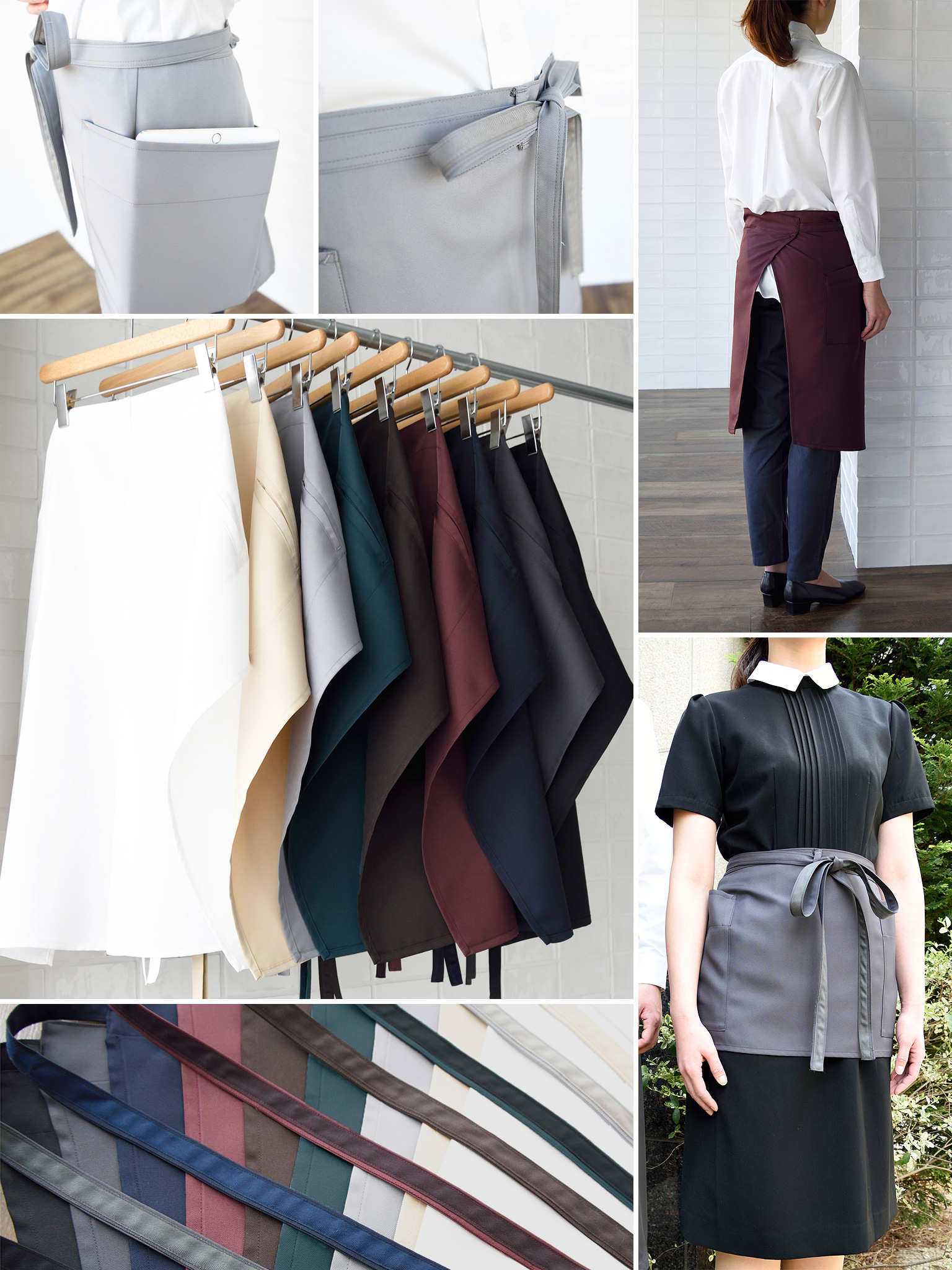 ユニフォームにおいて、サイズ選びは重要です。エプロンも着用する人の身長とエプロンの丈のバランスによって、その印象は全く変わります。この腰下エプロンは、素材感を活かしたシンプルなデザインのため、少し長めのシルエットになる様に着用していただきたいエプロンです。そのためミドルとロングの丈違いをご用意していますので、ぜひ身長に合った丈サイズを選んでください。カラーパレットは特に濃色の色表現にこだわって、白や黒のフォーマルなシャツはもちろん、私服をベースにした仕事着とも相性の良い、シックで落ち着いた色で揃えました。