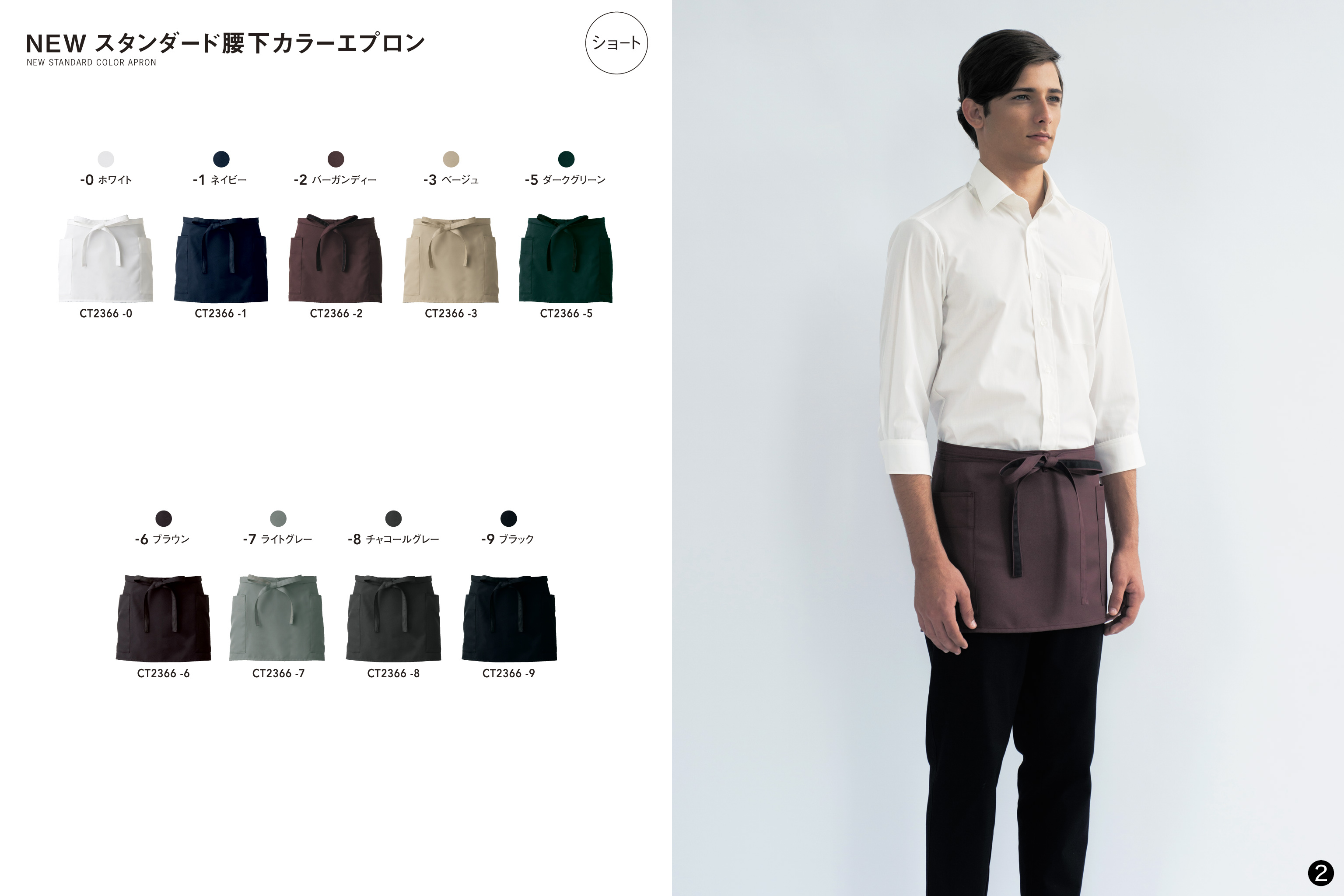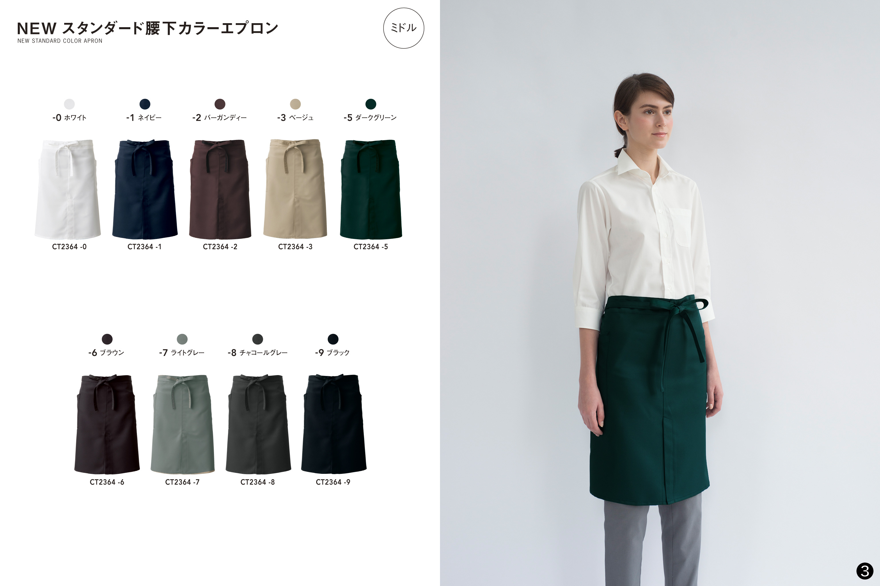 新製品の新定番エプロンシリーズ「NEWスタンダード腰下カラーエプロン(CT2366、CT2364、CT2365/丈サイズ違い3種・各全9色)」は、ポリエステル100%の丈夫な素材でありながら、滑らかで落ち感と光沢感のあるシルクの様な質感です。