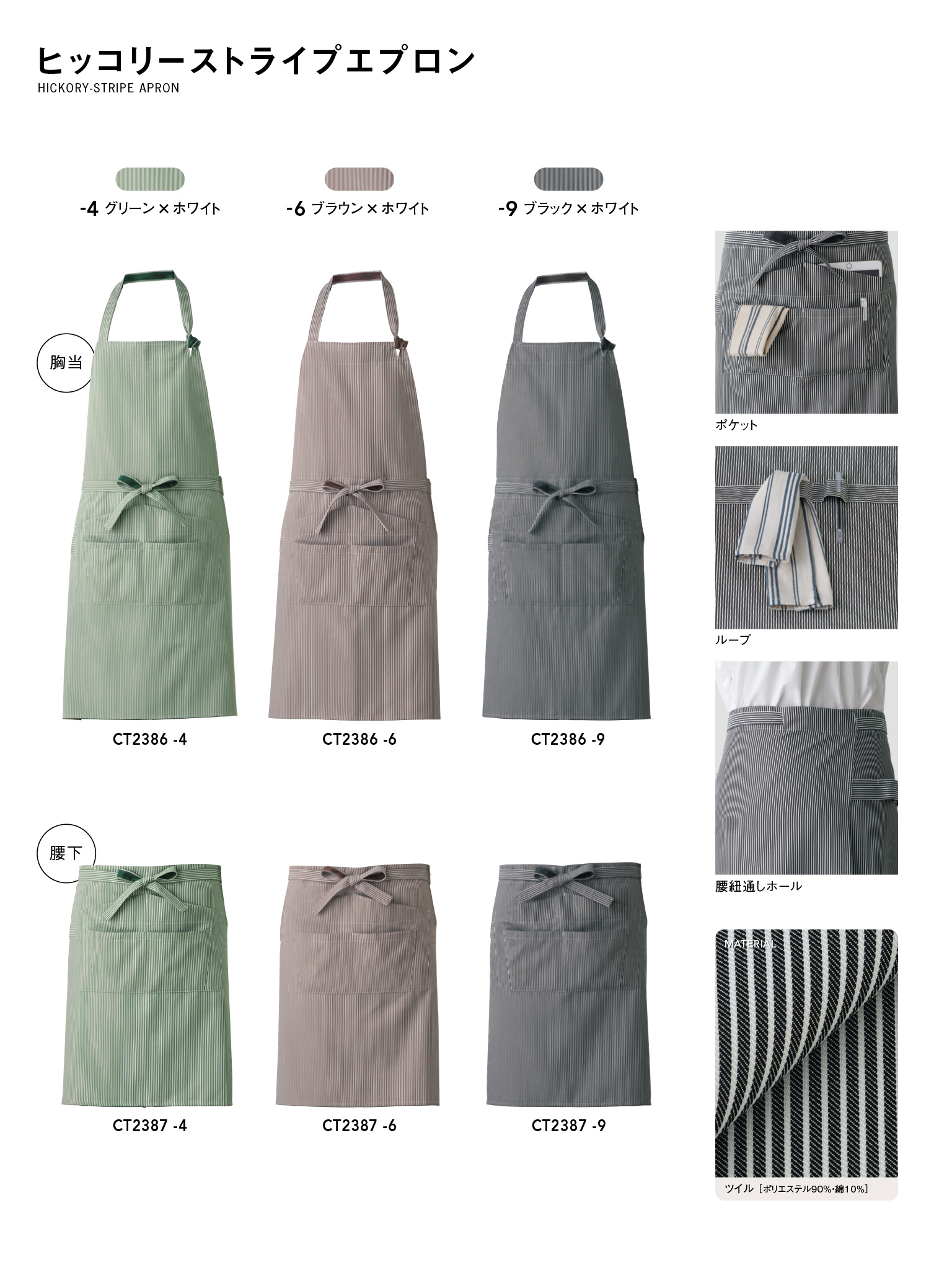 「胸当エプロン(CT2386)」は肩紐と腰紐の裏側に、「腰下エプロン(CT2387)」は腰紐の裏側に別布テープを施し、結び目が滑りにくく、またデザイン的なアクセントとしています。バックの腰紐通しホールで紐がズレず、すっきりと綺麗に着用できます。腹部に2段・計3つのポケット、右腰にはペン差しや布巾掛けとして使えるループが有り機能的です。色はそれぞれ、グリーン×ホワイト(-4)、ブラウン×ホワイト(-6)、ブラック×ホワイト(-9)の3色をご用意しています。この新製品「ヒッコリーストライプエプロン」の詳細は、総合カタログの最新版「SEVEN CATALOG 2017」をご覧ください。ご請求は下記のフォーム、またはお近くのセブンユニフォーム販売店へ。また、このシリーズとのコーディネートに合ったインナー・シャツ、アクセサリーなどについても、セブンユニフォームの各ショップへご相談ください。最適な商品をご紹介させていただきます。